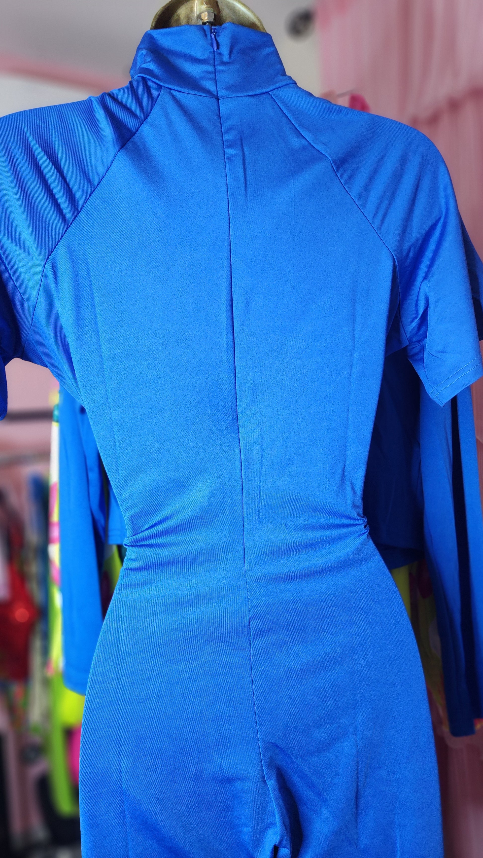 Enterizo azul royal 100% lycra entalle alto al cuello y cierre con zipper en la espalda alta.