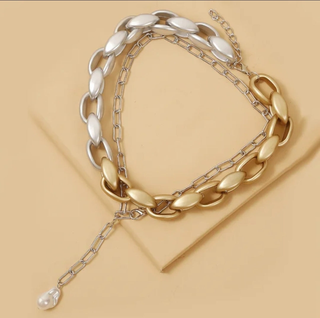 Collar dorado & plata mate, cadena en tonalidad plateada ajustable con perla colgante