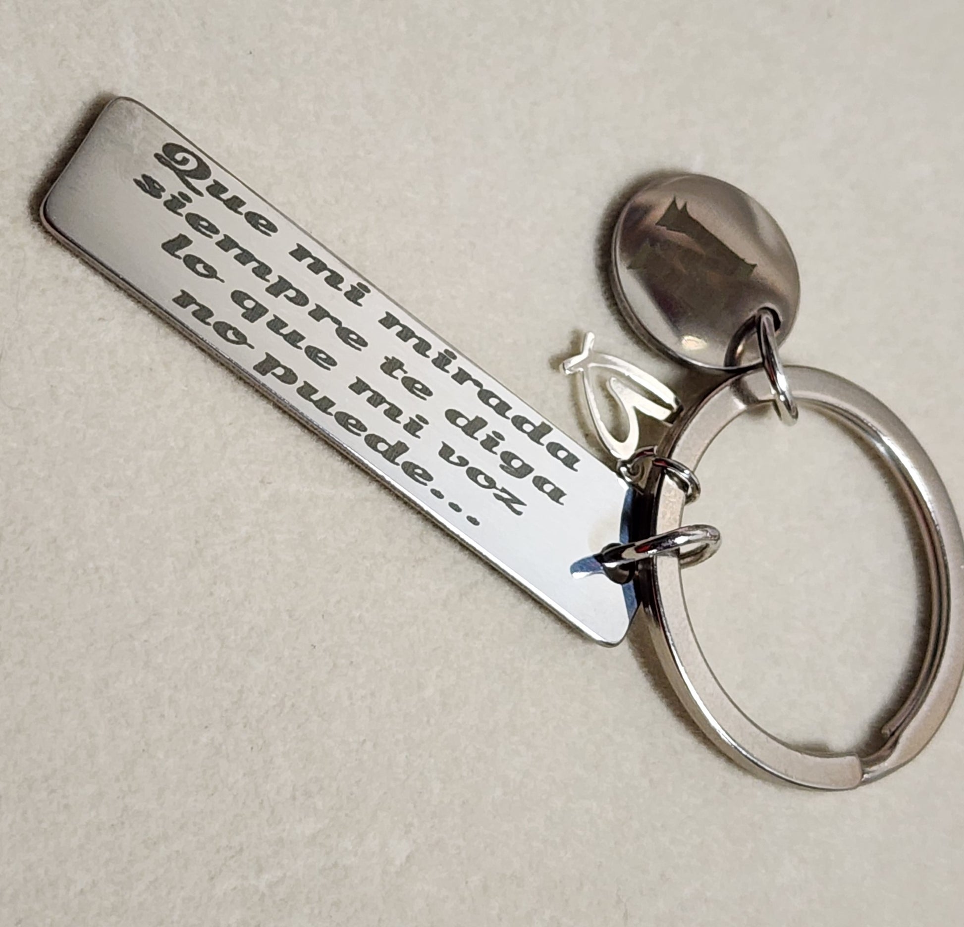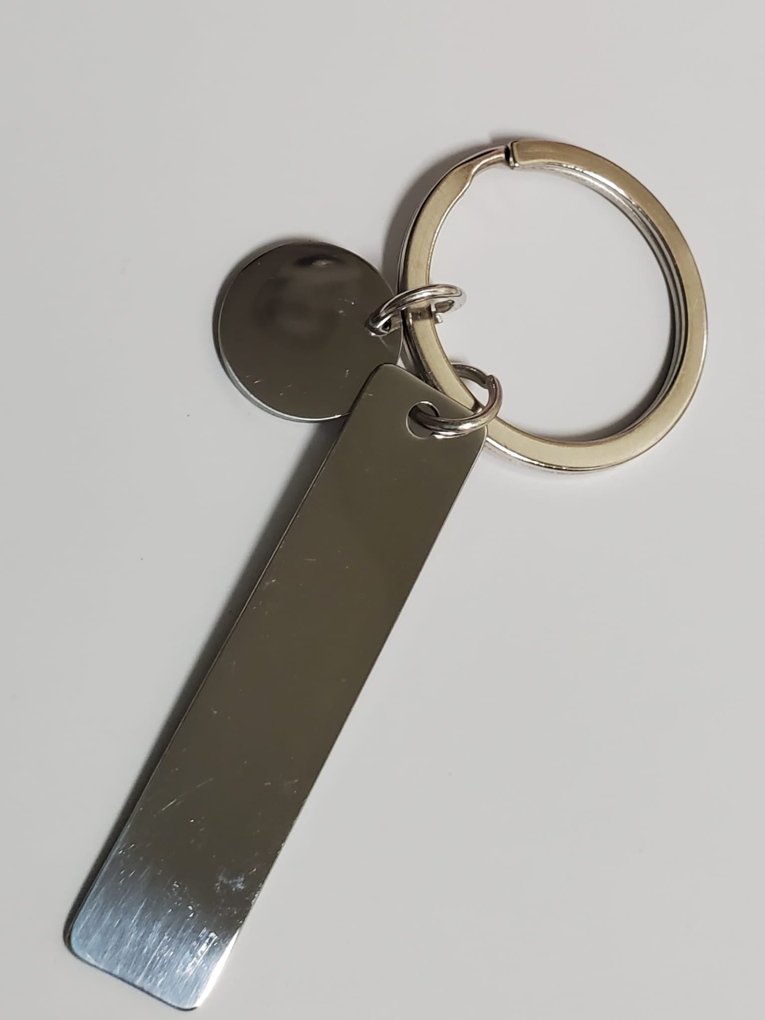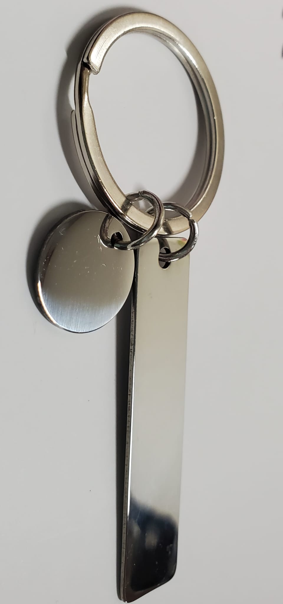 Llavero en stainless steel, puedes grabar nombres o frases cortas en la barrita y alguna inicial o dibujo pequeño en el circulo.