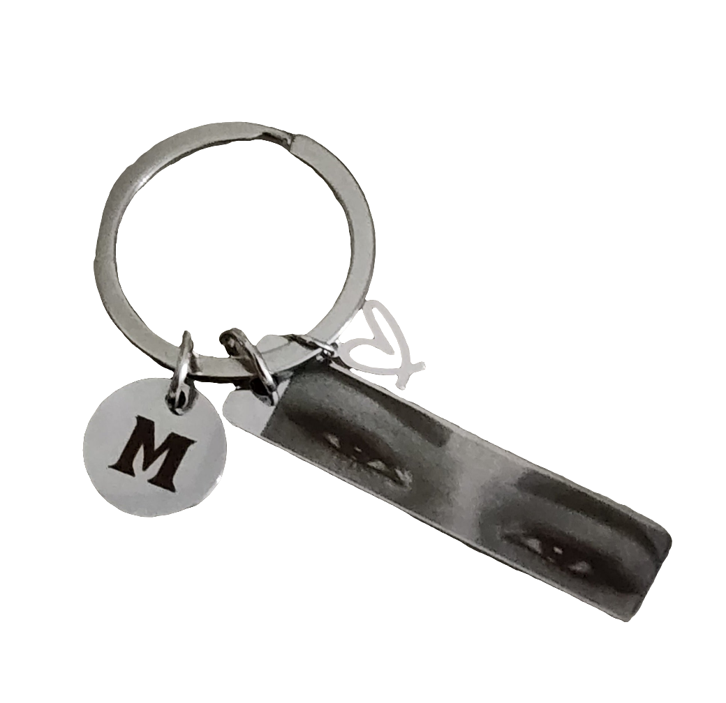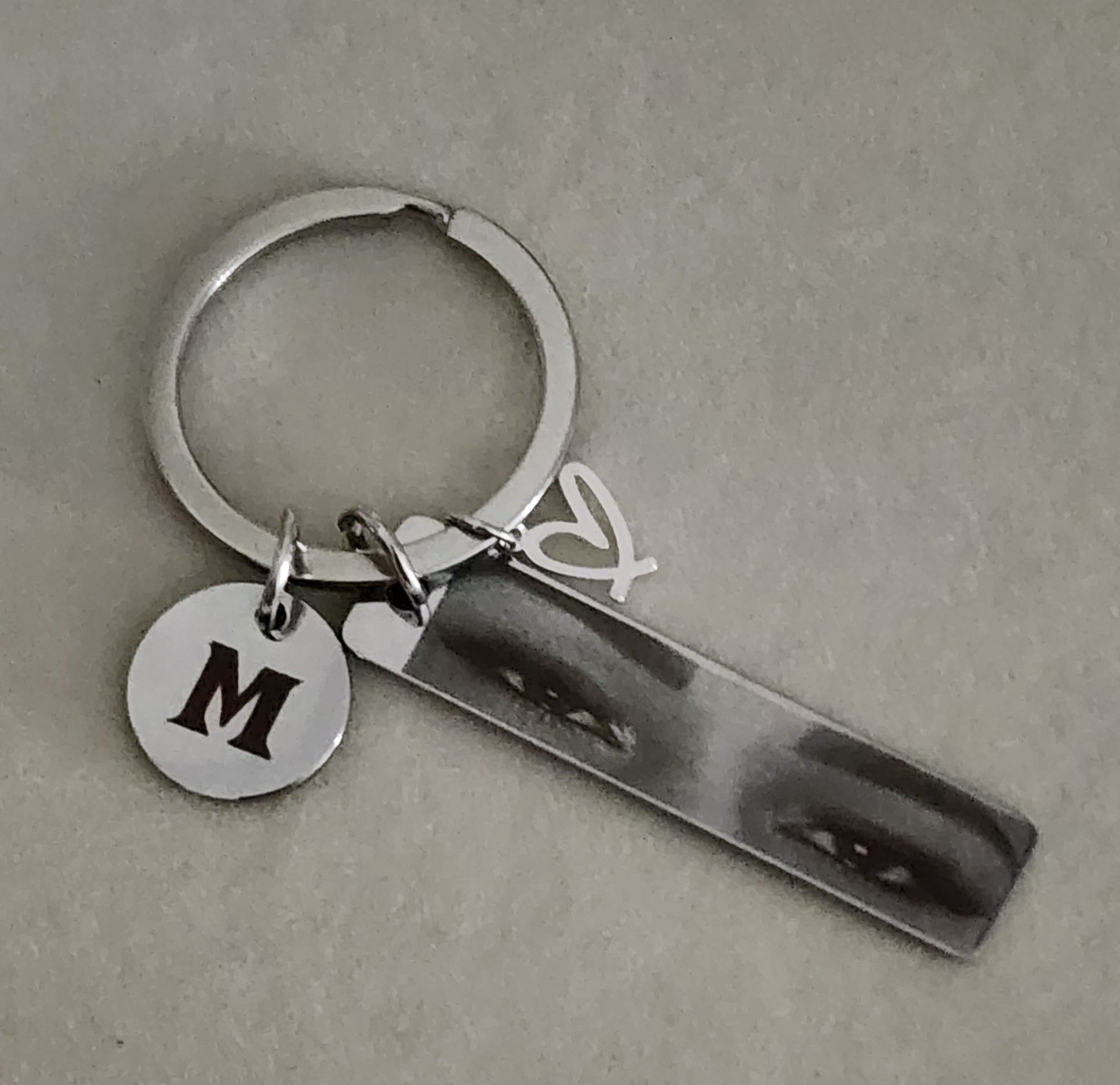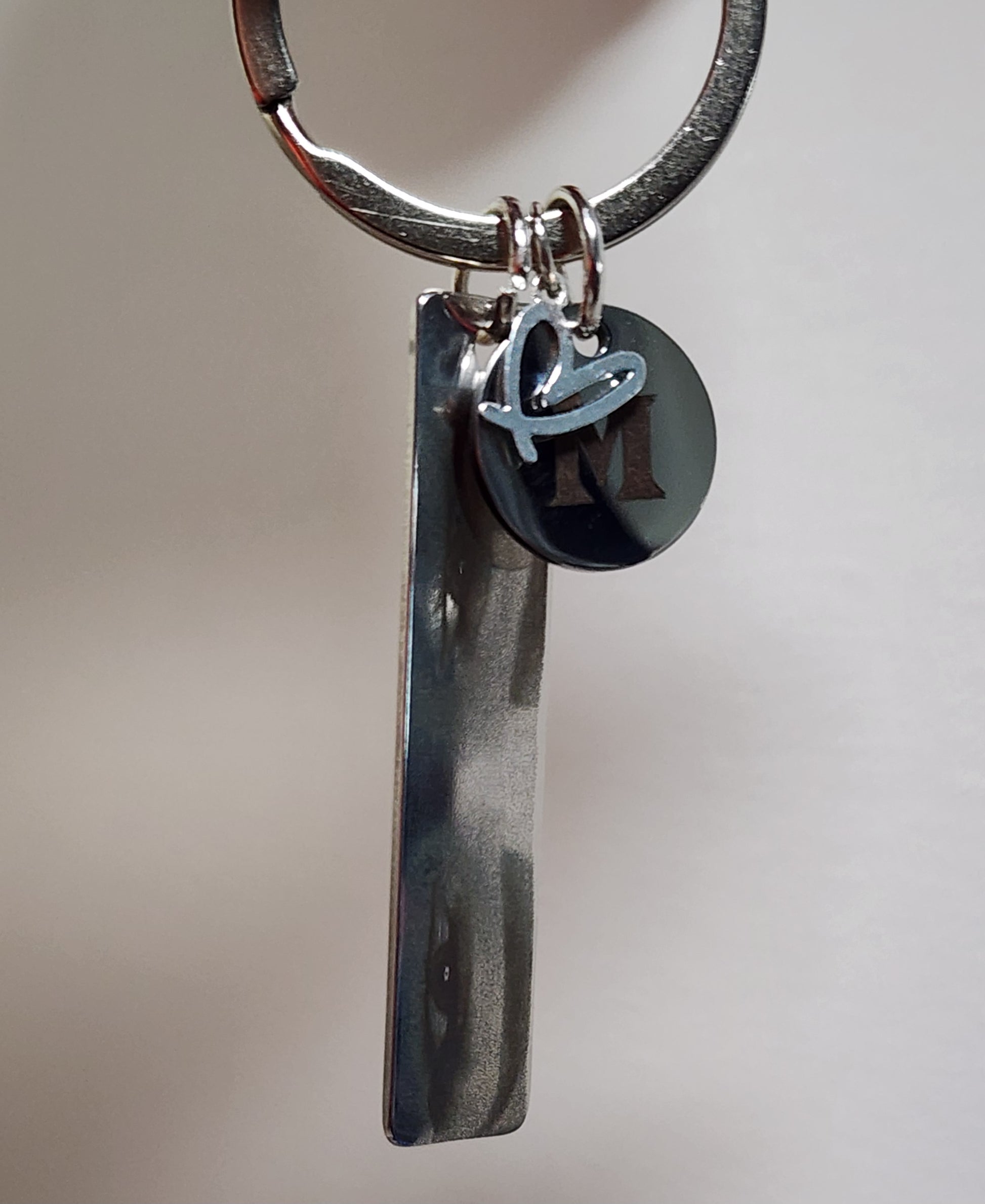 Llavero en stainless steel, puedes grabar nombres o frases cortas en la barrita y alguna inicial o dibujo pequeño en el circulo.