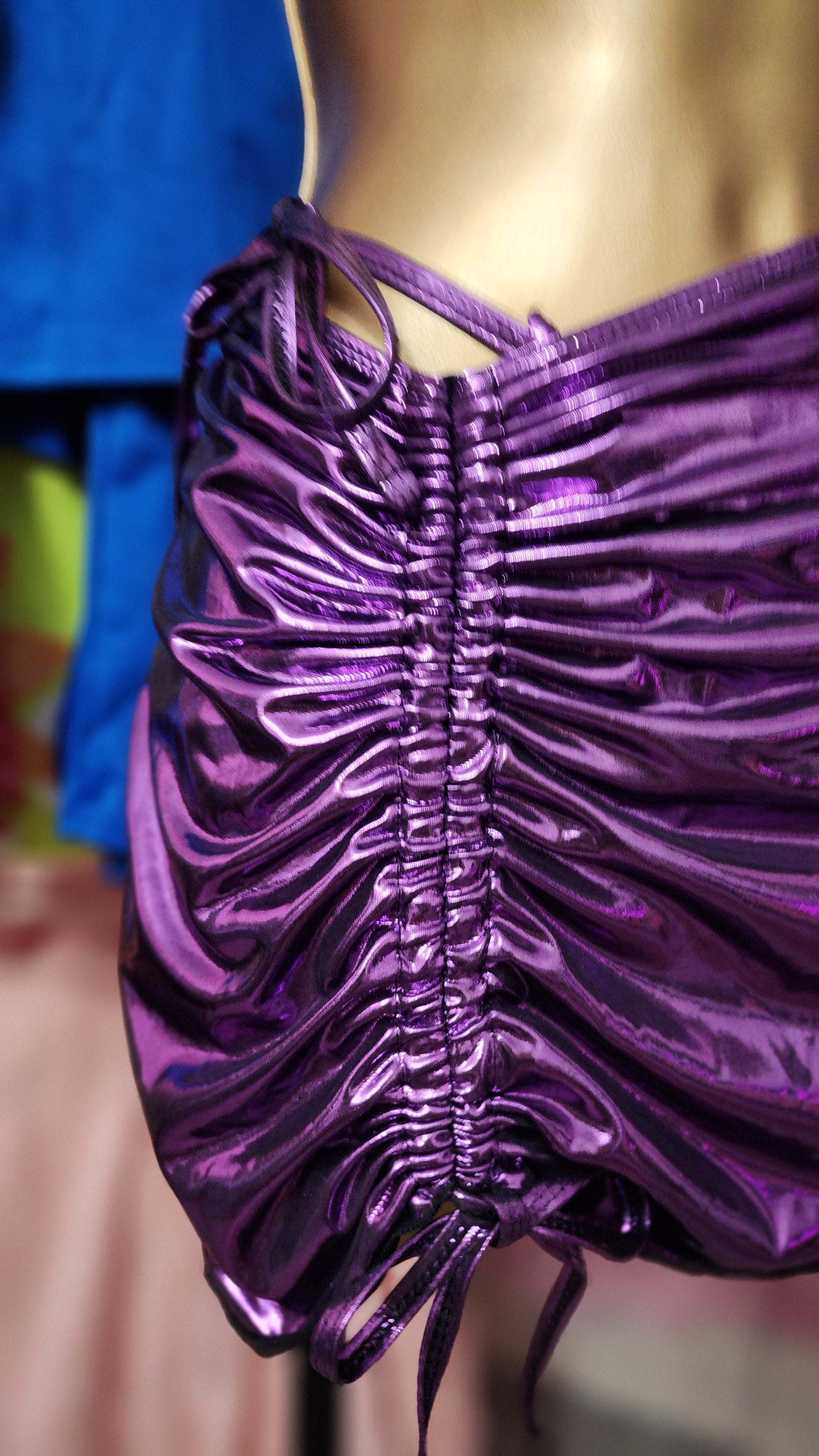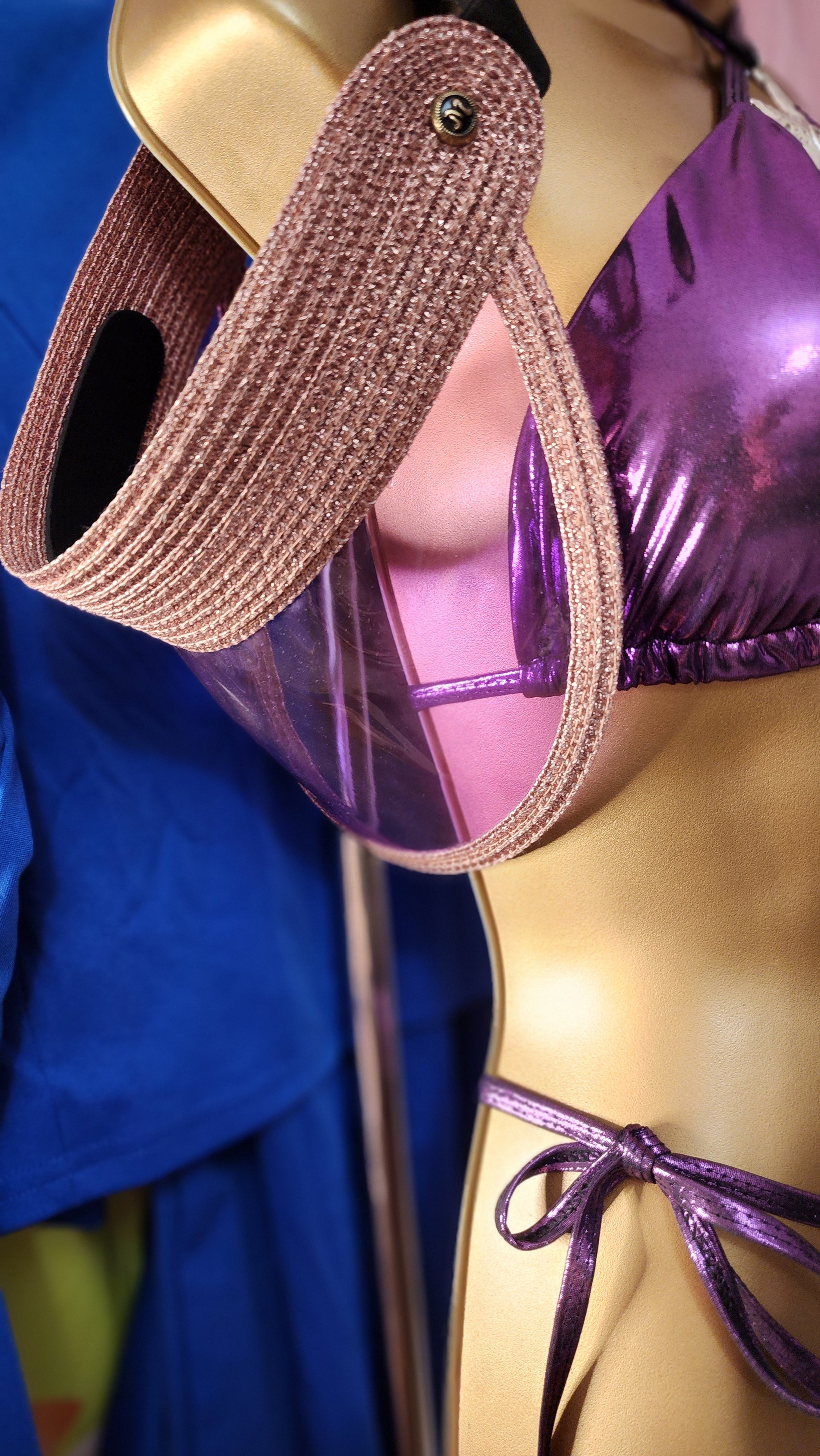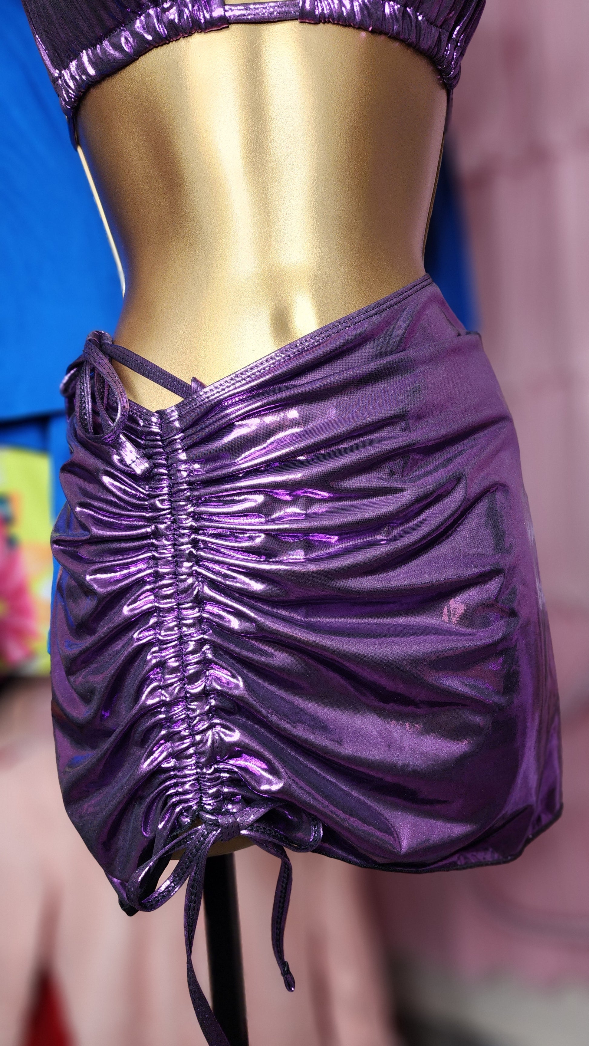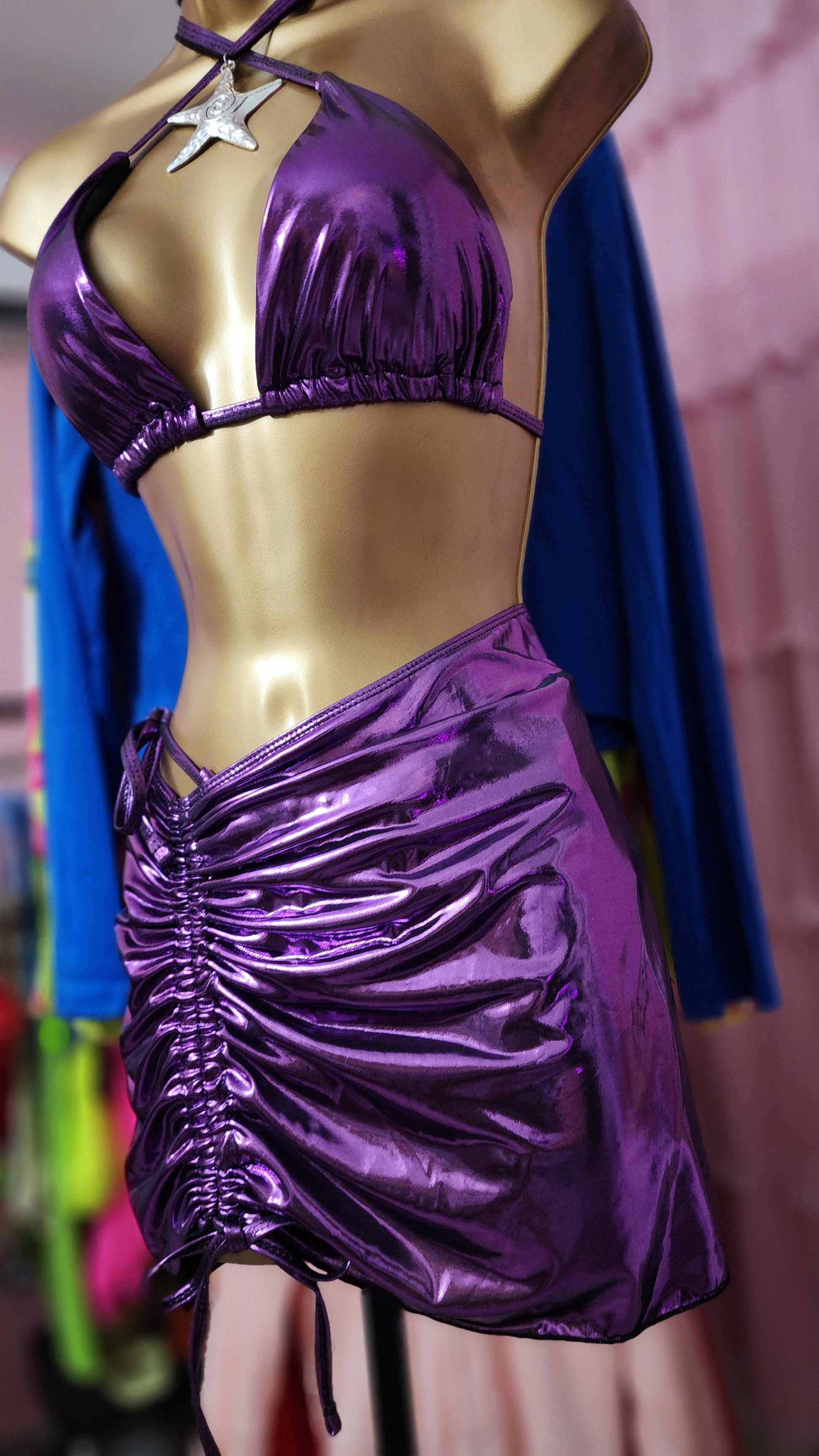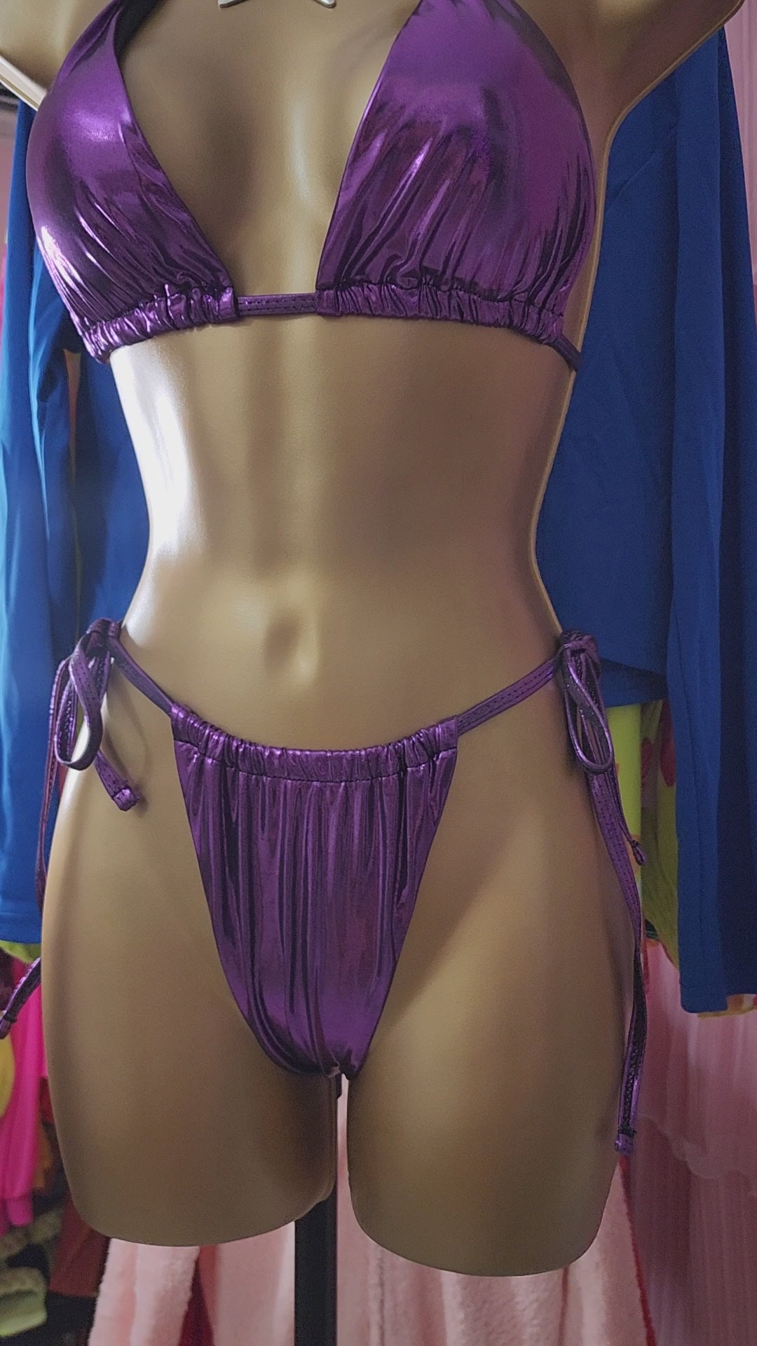 Traje de baño 3 piezas violeta metálico (bikini top, bikini panty y falda) corre al size, trae copitas (cubre pezón) removibles, bikini de entalle alto semi tong ajustable, falda con tirantes ajustables para crear look asimetrico.