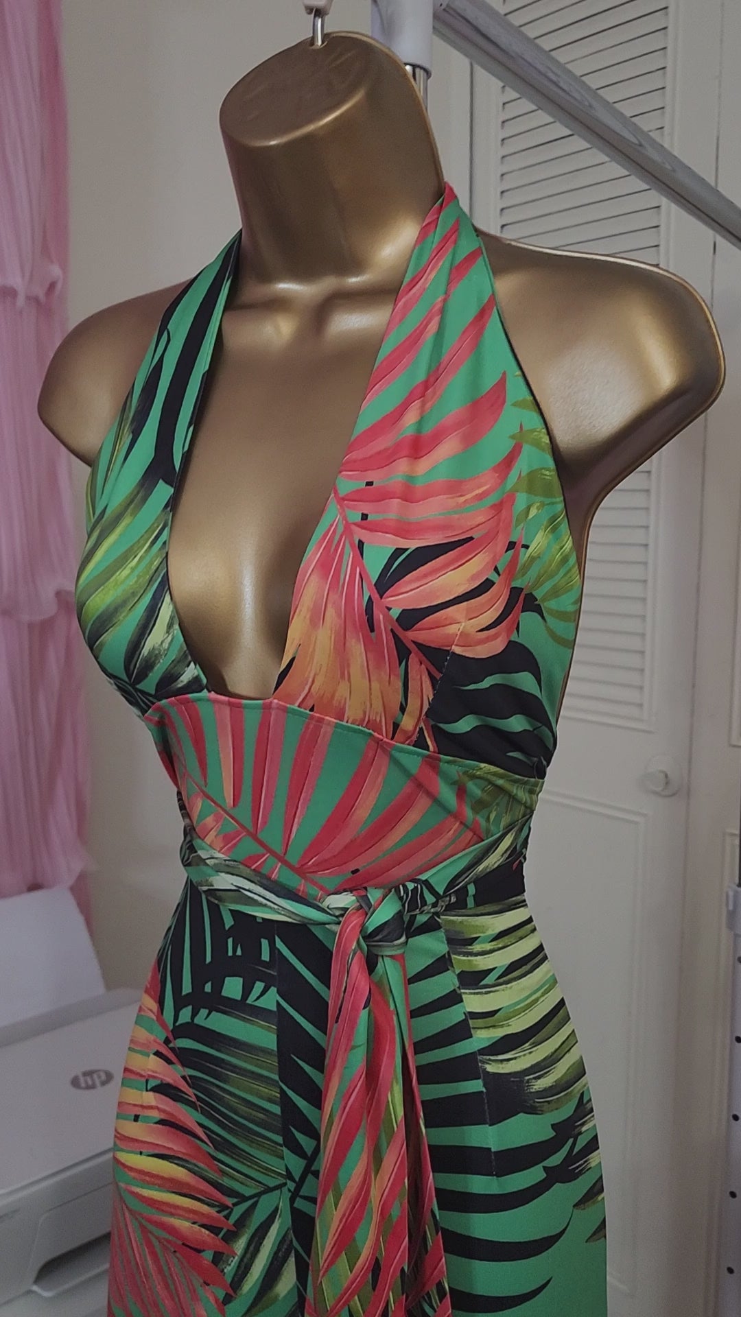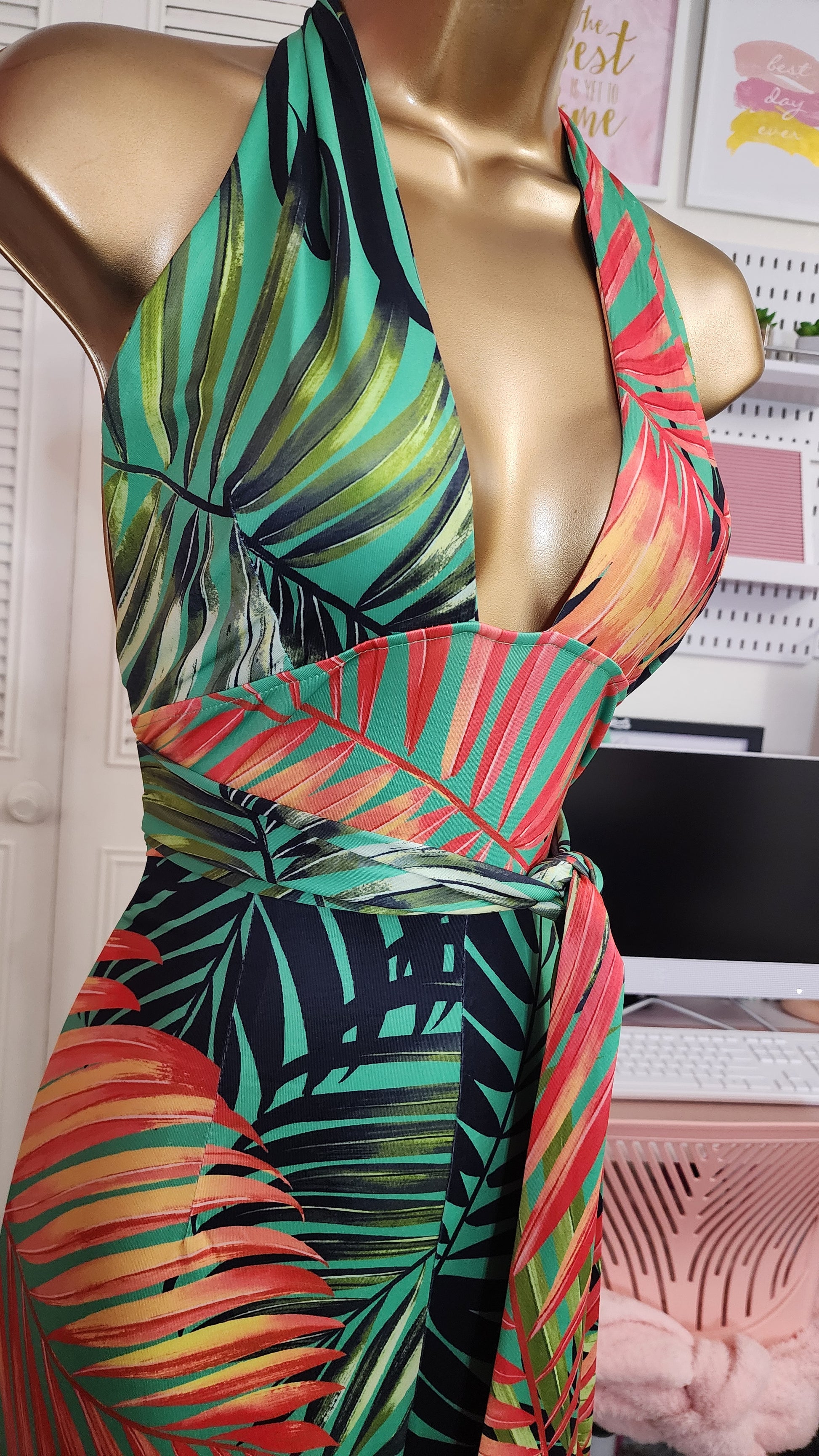 Jumpsuit largo tela lycra gruesa, soble forro en área del busto, cinta en la cintura que puedes amarrar a tu gusto alfrente o a la espalda. "Hulter" amarre al cuello con 2 botones, para mayor soporte puedes amararlo. (A tu discreción) su print es en colores vivos mezclado con negro dándole un toque de elegancia. Su escote es bastante pronunciado " V " en la parte del frente, pero nada no raya en vulgaridad.
