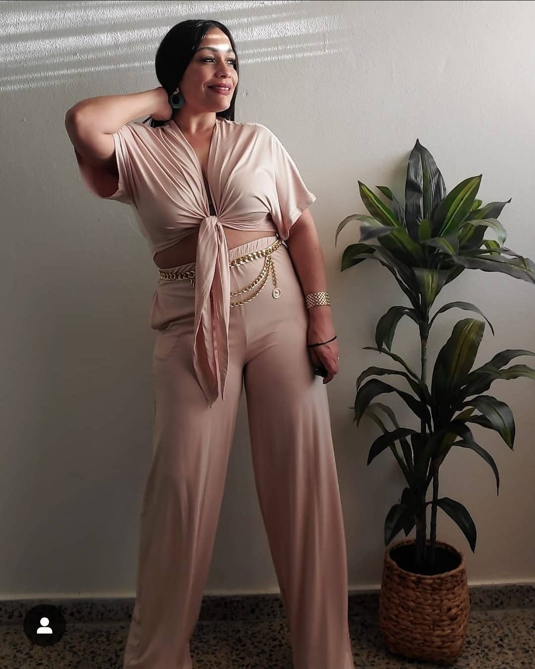 Set 2 piezas corre al size, 70% poliéster 15% lycra 15% algodón, expande bastante, puedes size down.